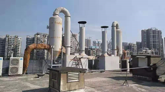中国移动华中某省公司网管中心,2台备用三菱柴油发电机组位于一楼,采用位于楼顶的旋流塔水喷淋设备治理柴油机黑烟,该套水喷淋设备已严重锈蚀,失去净化处理功能,同时因腐蚀导致烟管和处理设备锈迹斑斑,供水管道及泵阀已锈穿,致使脱落的锈迹与发动机黑烟形成红黑混合烟气,大量颗粒物飞散弥漫,污染空气,严重影响工作人员和周边居民的身心健康。