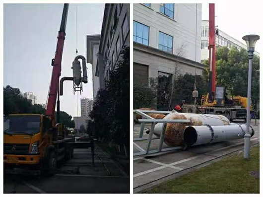 准备起吊原本锈蚀报废的螺旋塔水喷淋设备